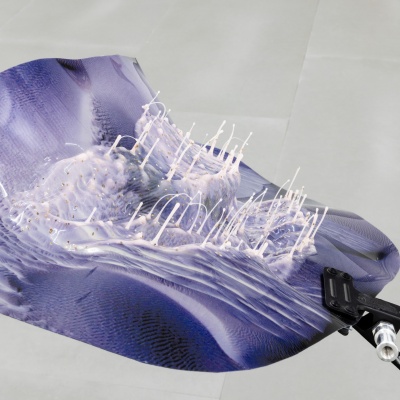 本作由立陶宛艺术组合Pakui Hardware创作,采用热处理UV打印、硅胶、乳胶等材料,展现了生物与技术、流动与变形的主题。作品呼应“Sistemas Fluidos”展览对流动性、身份与社会结构流变的关注,是展览中极具代表性的装置之一。