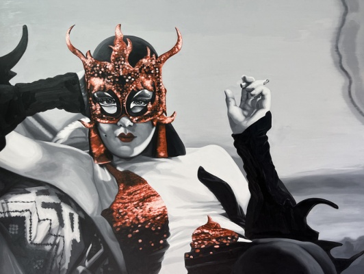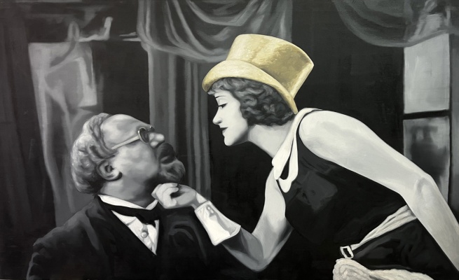 这幅作品以Marlene Dietrich在电影《蓝天使》中的经典形象为蓝本,通过细腻的笔触与色彩,展现了女性在男性凝视下的复杂身份。Cristina Toledo借此探讨了“蛇蝎美人”形象如何在银幕与现实中反复被塑造和消费。