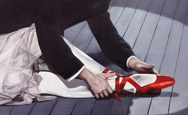 灵感来源于Moira Shearer主演的同名电影,画作捕捉了主角在舞台与现实间挣扎的瞬间。通过对色彩与光影的处理,艺术家强调了女性艺术家在追求自我表达时所面临的社会压力与牺牲。