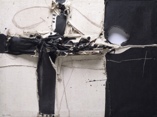 这件作品是马诺洛·米利亚雷斯的代表作之一,创作于1962年。艺术家使用丙烯颜料在粗麻布(arpillera)上创作,尺寸为97 x 130厘米。米利亚雷斯以其对粗麻布这种材料的运用而闻名,他常常撕裂、缝合、穿刺画布,将绘画转化为一种近乎雕塑性的、充满创伤感的物质存在。这幅《画作183》典型地体现了非形式主义对物质性和手势的探索,画面上的撕裂与拼贴痕迹,不仅是形式上的创新,更被视为对战后西班牙社会与个人生存状态的深刻隐喻和无声抵抗。