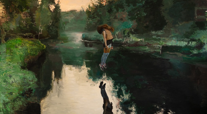 这幅大型油画以梦境般的构图和精致的色彩,展现了人物在水面上方飞翔的瞬间。画面既有现实的细腻描绘,也融入了超现实的氛围,与展览“飞行”与“影子”的主题紧密相连,体现了Navarro对传统与当代的双重致敬。
