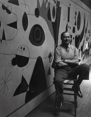 这幅壁画是米罗与美国艺术界深度交流的代表作之一。照片展现了米罗在美国的重要创作现场,象征其艺术影响力的国际扩展,也是“米罗与美国”展览的核心档案之一。