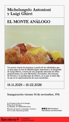 “El monte análogo”(类比之山)是一场由策展人Frederic Montornés策划的摄影与电影跨界展览,聚焦意大利著名导演米开朗基罗·安东尼奥尼(Michelangelo Antonioni)与摄影师路易吉·吉里(Luigi Ghirri)的对话。展览以视觉随笔的方式,探索两位艺术家在影像语言、对自然与山脉的感知、以及现实与想象之间的界限。安东尼奥尼的《Muntanyes encantades(魔幻山脉)》系列以拼贴、粉彩等多种技法,展现出色彩与形态的诗意变幻;而吉里的摄影则以细腻的观察和哲思,打破观众对山脉的固有认知。展览名称取自法国作家雷内·多马尔的同名小说,邀请观众在影像与思考间慢慢行走,重新审视人与世界的关系。