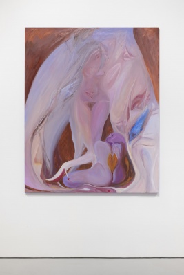 这幅布面油画是展览中的代表性作品。画面以垂直构图展开,深邃的蓝色背景中浮现出粉红与奶油色的层次。作品体现了Scavullo对感官氛围的营造,以及她对能量转化和身体记忆的探索。画中可能出现的自创符号或模糊形态,邀请观众进行一种非语言的身体性观看体验。