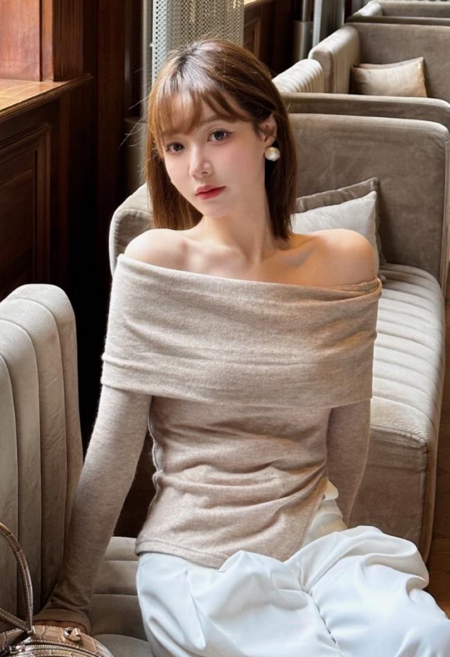 一字领剪裁自然拉长颈线,米灰色温柔质感十足,单穿利落又有氛围!