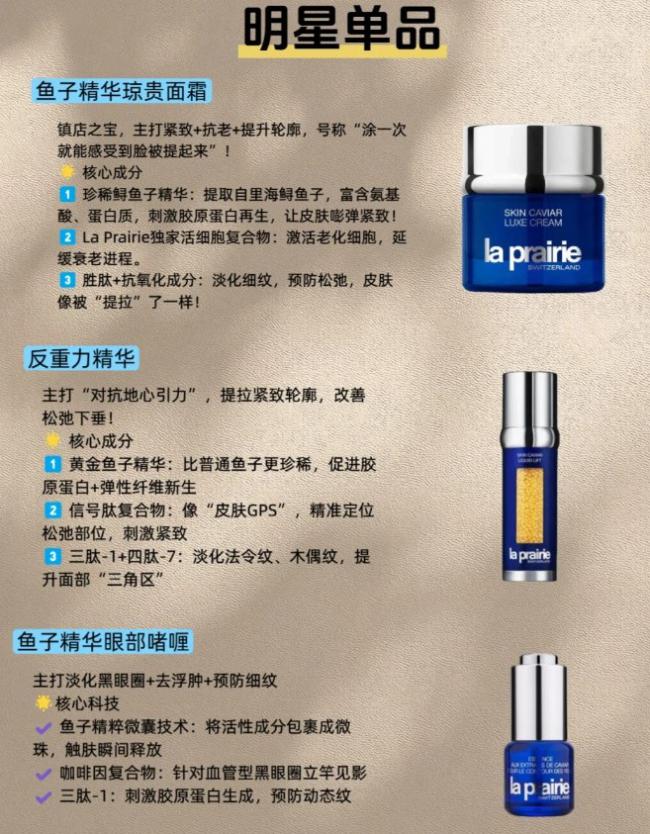 大家耳熟能详的La Prairie鱼子精华系列,是他们家引以为傲的明星产品线,纯净尊贵的鱼子精华可以帮助提升脸部轮廓,让松垮的脸蛋UP,是很多小伙伴超爱的抗初老神器,口碑爆表!